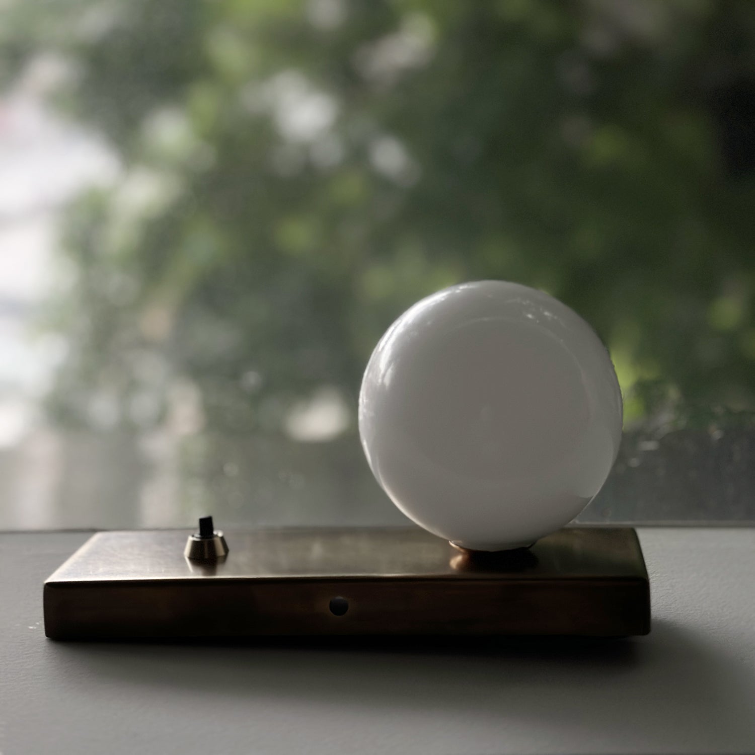 Two milky glass globes, like drops of opal — held in balance by antique brass or stainless steel.